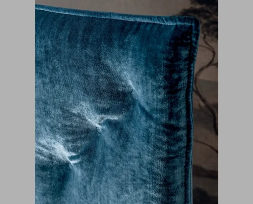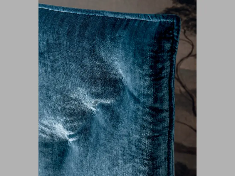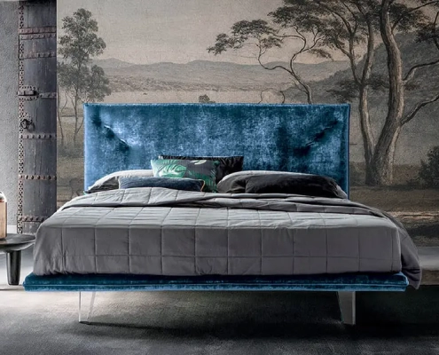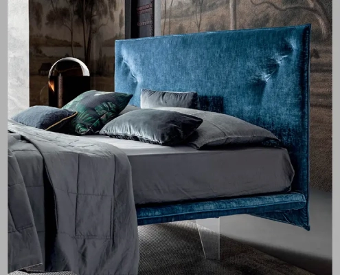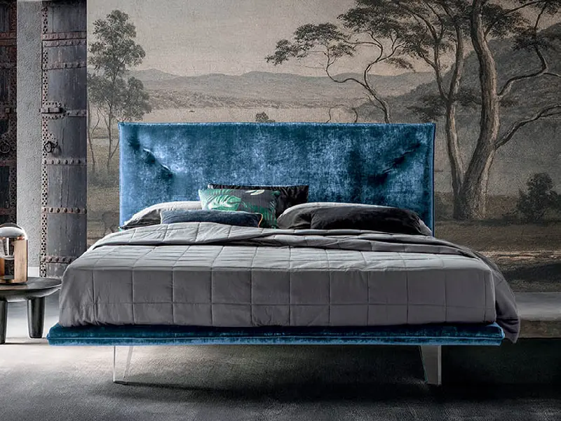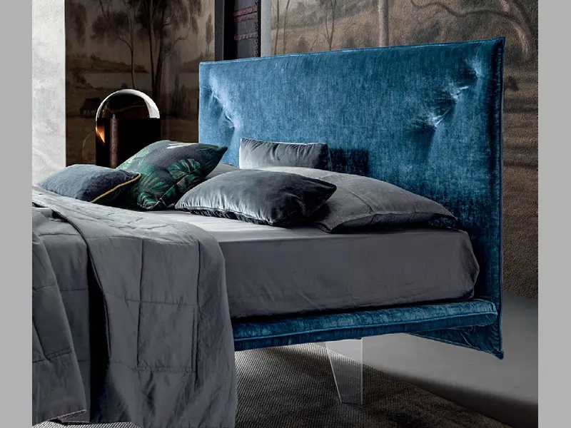 Bed with a refined design and compact dimensions; the suspended headboard and bed frame combined with the transparent methacrylate feet give a touch of lightness with very small dimensions.